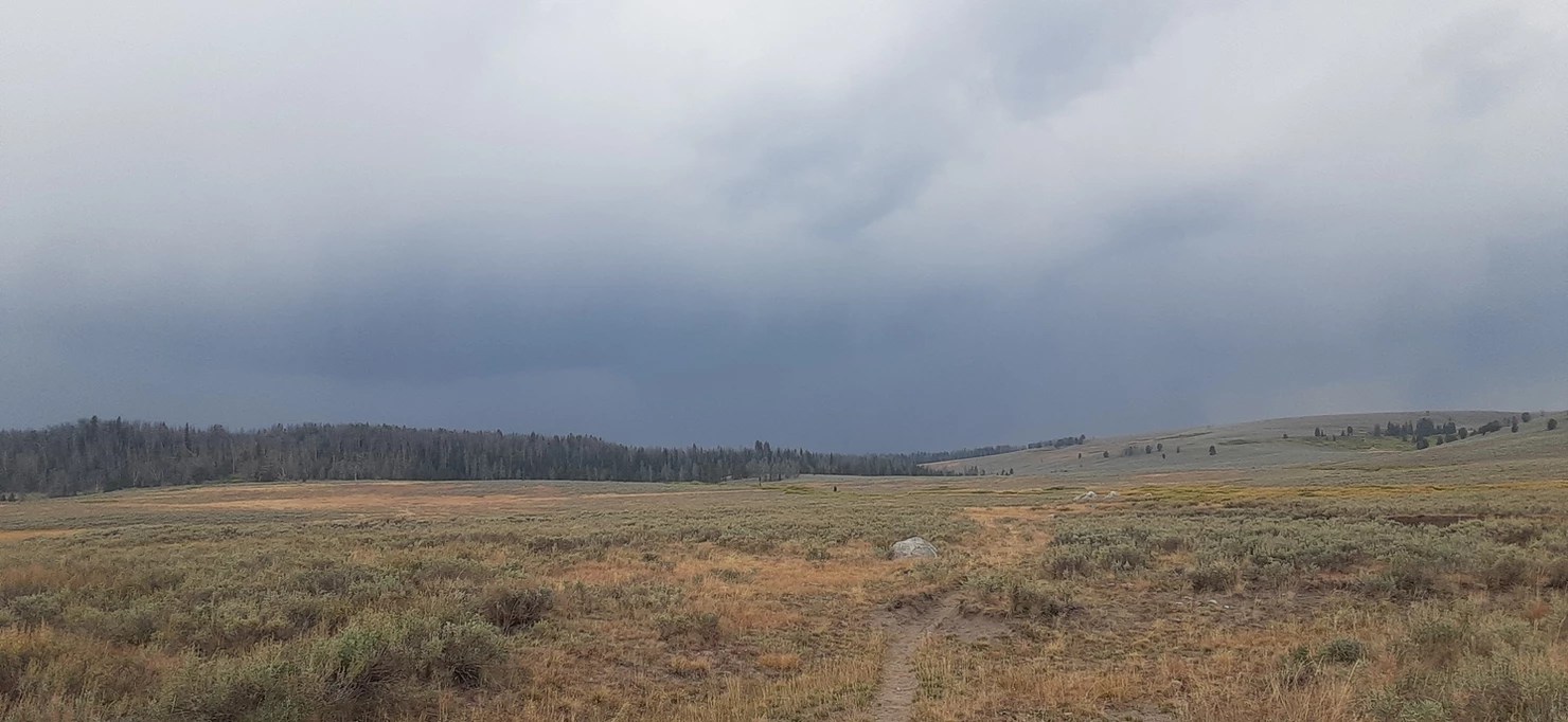 I was counting between the lightning and the thunder. I seldom got past “three one thousand.” Much too close for comfort, especially since I was the tallest thing by far for miles and miles. I was in a huge meadow peppered with very short sage, crossing stream after stream while the lightning flashed around me. I did pass pretty close to the bear, who had not moved too far off, but by now I was more concerned about being struck by lightning than I was about being attacked by a bear.