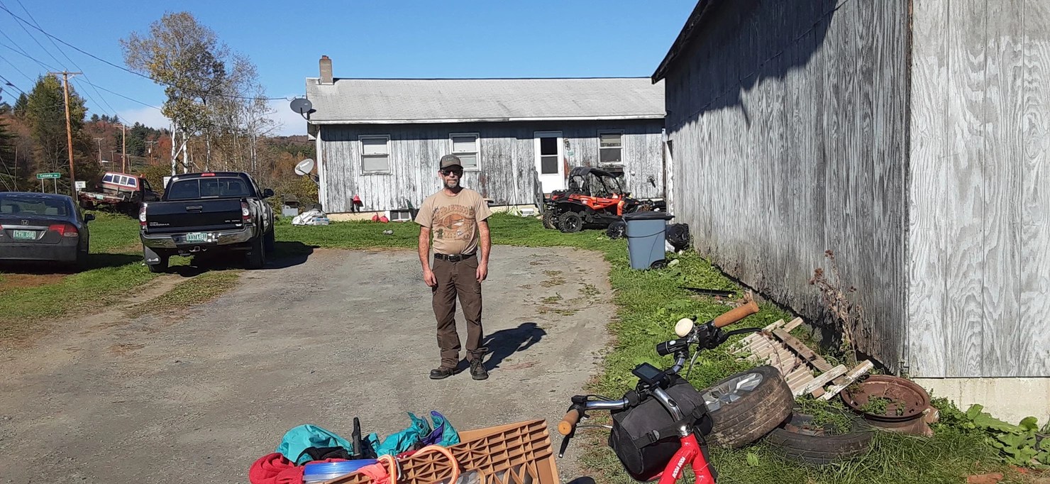 I am pooped. 78 miles and 14 more towns (I’ve lost track how much was on dirt and how much paved). That puts me at 83 of the 251, so almost a third! I have one more run to make in the northeast before crossing the mountains and starting on the northwestern quadrant. So far, the weather has been incredible, with temps in the sixties and colorful foliage still decorating the mountains. Besides the glorious ride, some highlights of today included meeting the Birdman in Cabot (sculptor Edmond Menard; LOTS more about him later), meeting Bobby in Marshfield, and stopping at two farmstands. I pulled into my nighttime stop with a dozen ears of corn strapped wherever I could find places on my bike. I am staying tonight with friends—the daughter and son-in-law of Karen Deets, who helped me know where the fires were on my CDT hike. More when not so tired.