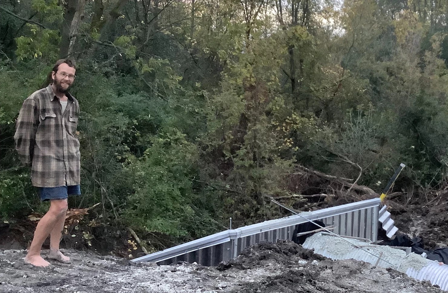 When I arrived at the construction site, I knew I had met my match. The muddy ditch was deep enough to contain huge construction vehicles. The culvert was so high that there was a ladder leaning against it. I searched for a way around but could find none, as one side of the road was fenced in and the other dipped sharply to a stream. Then I noticed a barefoot young man on the other side of the ditch. He informed me he would help me get my bike through, as it would otherwise be a long ride around.