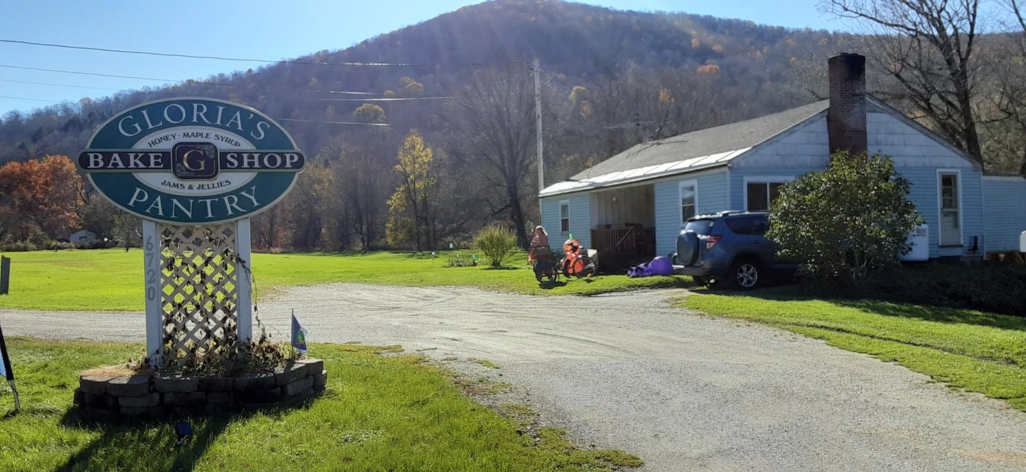 I passed through areas where there has yet to be a frost and the autumn-colored leaves are still clinging to the trees. In other areas, including where I am tonight, it is fully stick season. Temps today ranged from the low 40s to the high 50s, causing me to adjust my clothing layers all day. It was a bluebird day, and I was happy to be riding in it. Yet a muscle in one calf hurt for much of the day and I wanted to be done, feeling myself worn out and on the verge of tears. But then I met Gloria!