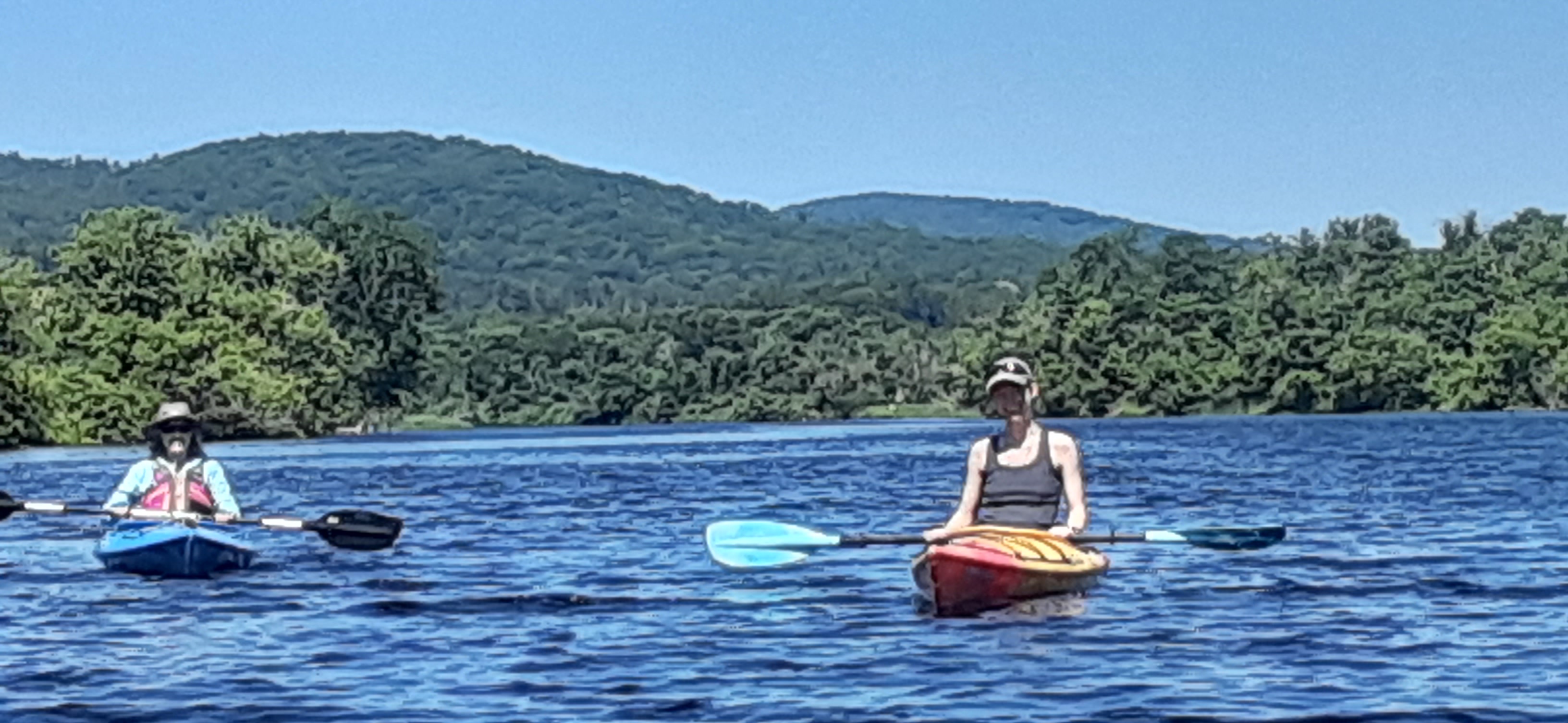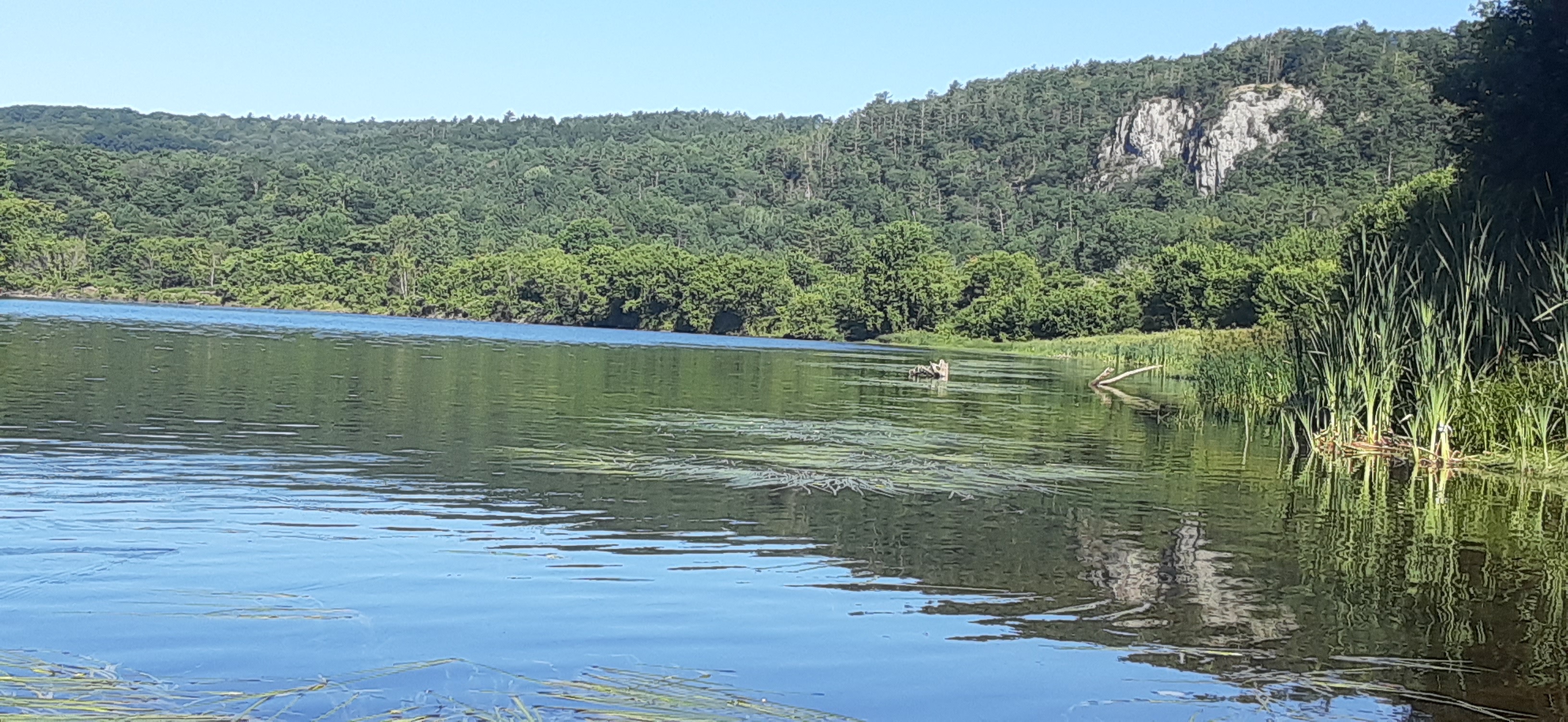 I met up with Angela and Celia exactly at our planned rendezvous time of 9:30 AM. After paddling a quick four miles in one hour it felt good to relax into their slower two mile per hour pace. Together, at that slower speed, we took time to listen to the sights and sounds surrounding us. We identified many birds, including kingbirds, kingfishers, chestnut sided and yellow warblers and more. We took pictures of the dinosaur-like river monster and were awestruck by the view of the Fairlee Palisades from the vantage of the river.