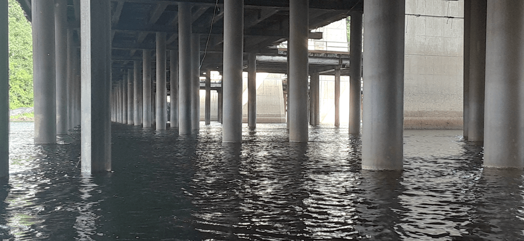 I saw a bridge ahead with a long line of cars on it and figured there was road construction going on. Just as I was thinking I wouldn’t have to contend with construction on the river, I did! There was a long line of scaffolds that I had to wend my way between. When I stopped for a minute to chat with the construction workers my boat smacked into one of the piers and I was reminded of the need to always be aware of what is around me on the river. Just like I always had to keep a level of alertness when I had a toddler in the house, I have to keep alert for changing. conditions on the water. I am much more relaxed than I was when I started this trip but I try not to get too complacent. I always try to maintain respect for the power of the river. There is a real difference between lack of fear and complacency.