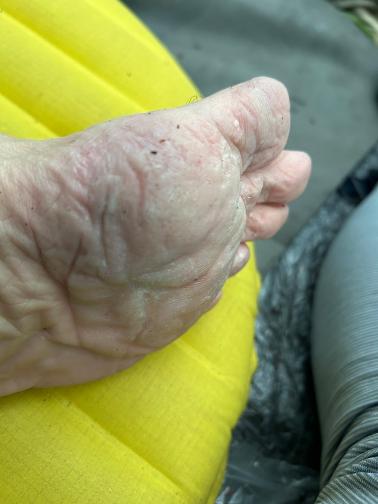 I finally broke a rule I try to keep to when hiking, which is not to take anything to numb the pain while I’m walking. My concern is that if I do this then I will walk past pain to a point where I could really have a serious injury. But I knew we had quite a few miles to go that night, including one significant climb and descent, and we had already lost quite a bit of time with the bear, so I took some ibuprofen. It didn’t completely knock the pain out of my feet, but it did turn the volume down so I wasn’t wincing every step of the way. But now Sarah was also having some foot issues. We stopped a few times to tape up her blistering feet. None of us had had dry feet for the four days we had been out and it was taking a toll on all of us.