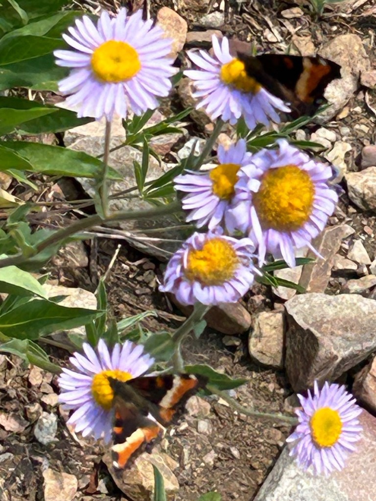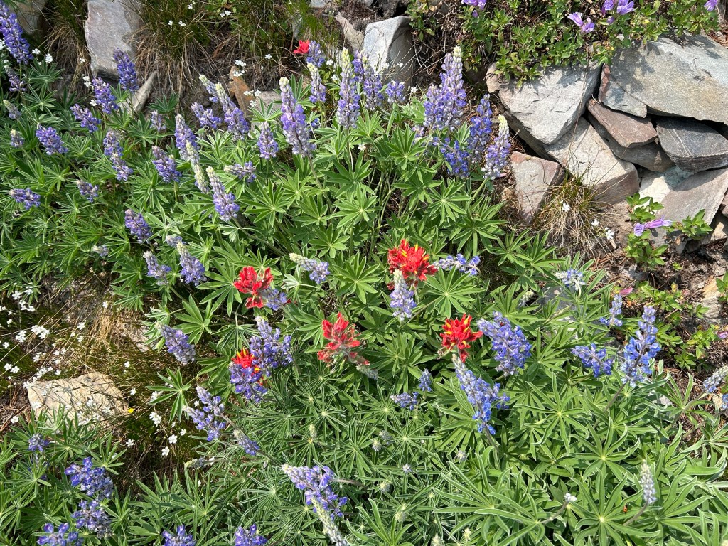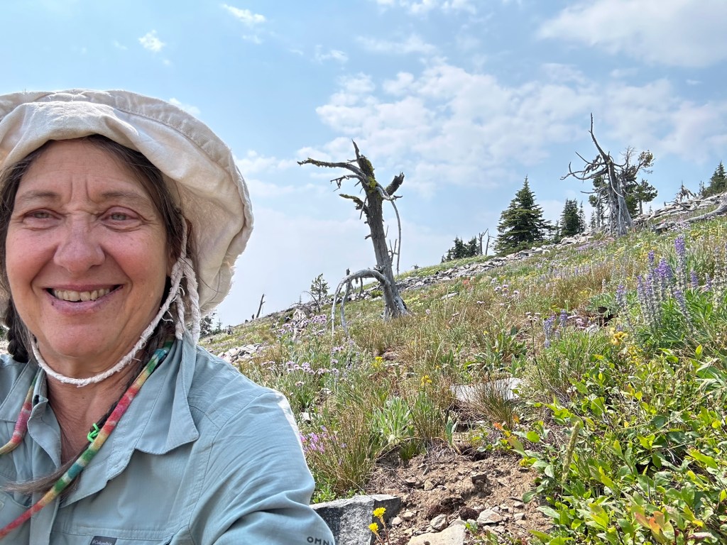 Near the top I plopped myself down in an incredibly beautiful meadow of flowers. Even though the distant views were hazy from both clouds and smoke of forest fires, I sat on a rock and fed my soul on the beauty around me.