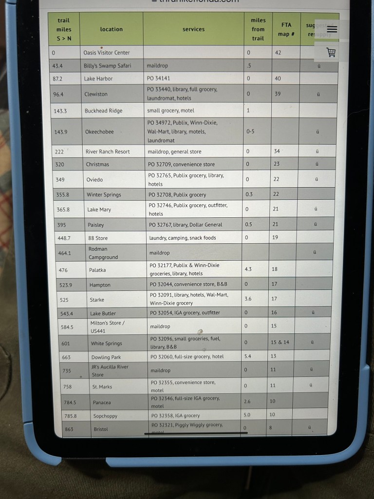 A possible resupply list for the Florida Trail that I found online
