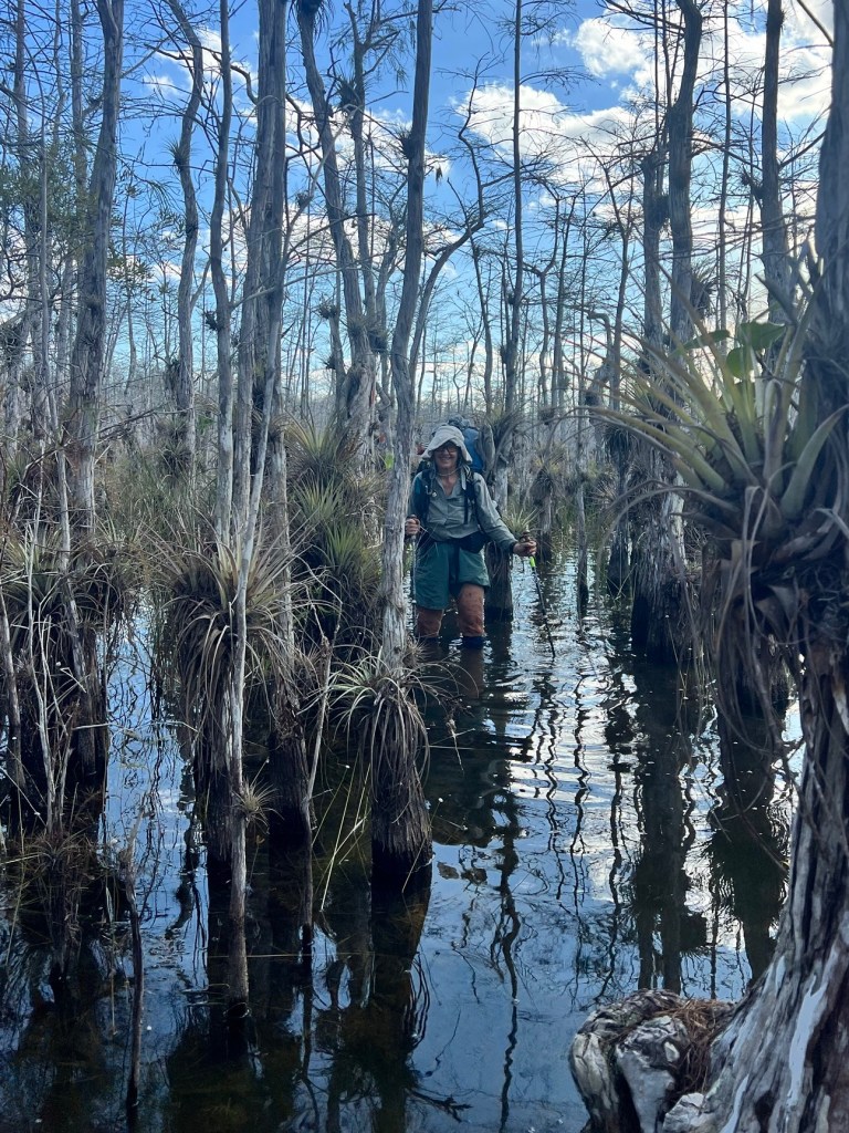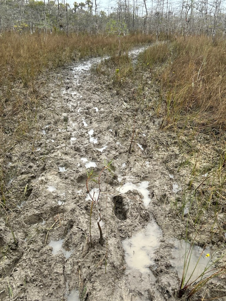 And like hiking in the swamp, if I keep a positive attitude I am able to enjoy whatever comes even when it is difficult. I used the moments of slipping throught he mud, tripping over a hidden obstacle and running in the water trying not to fall, and even twice falling, catching myself with my arms before completely submerging in the water, as moments to remind myself to slow down and look around. Rather than being stuck in the illusion some hikers have of the swamp being something to endure and get through as quickly as possible, I took on the illusion that others shared with me when they told me how beautiful the swamp was. I found a rhythm that worked for me and even though it was tiring I made really good time, channeling the inner child who might enjoy playing in mud and stomping through puddles. Granted the mud and “puddles” on the Florida trail were bigger than on any other trail I have ever hiked. And that is no optical illusion!