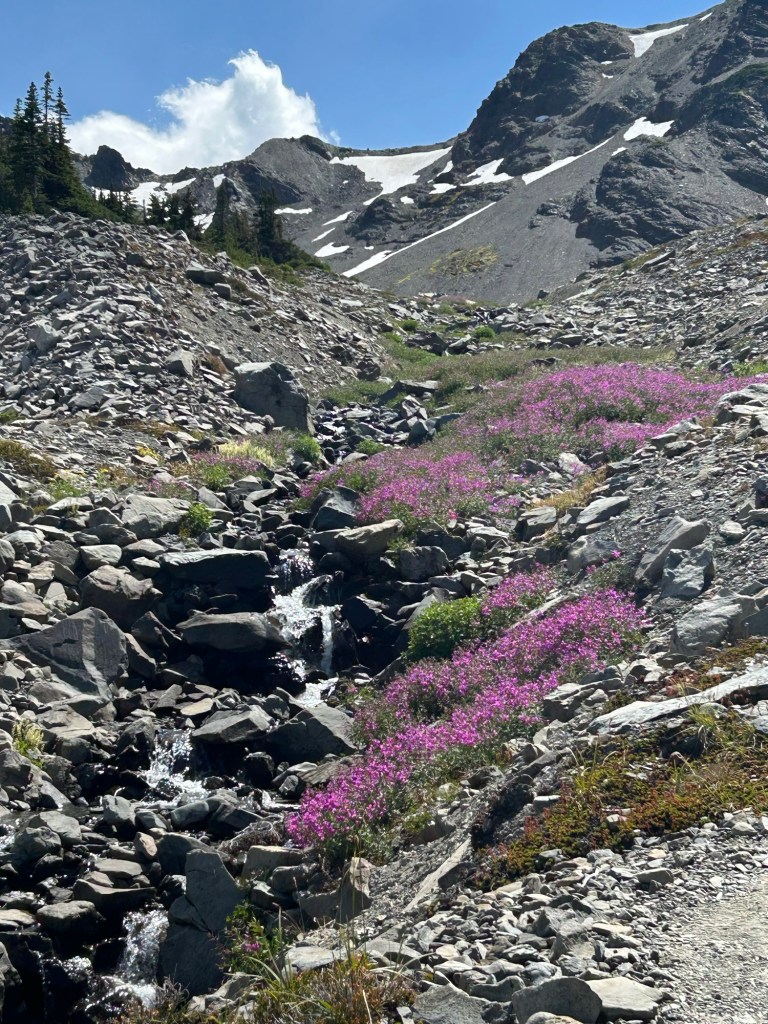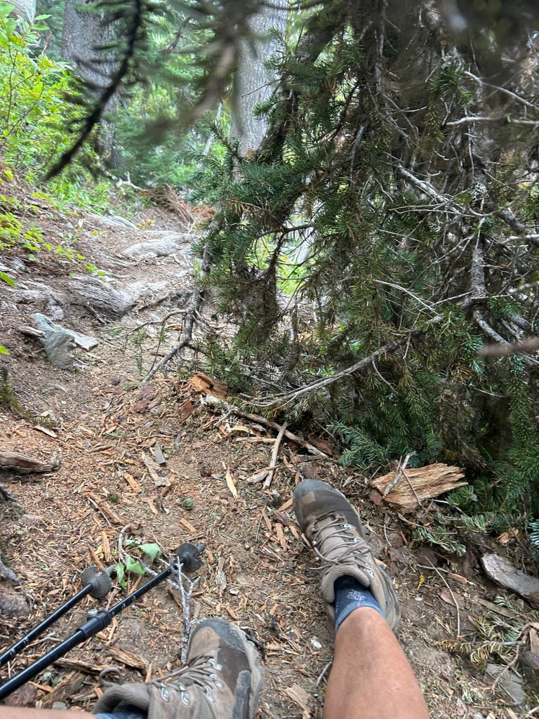 When I got into wooded sections, which were still quite steep but a little less daunting to me because I didn’t have the same visual sense of a sheer drop off, there were other challenges. Sometimes the trail followed a waterfall down, so the rocks were quite slippery. In another place, there were a lot of marmot holes along the trail. Sometimes they were covered up by vegetation so I had to not only be careful to keep my balance, but I had to probe into the overgrown trail ahead of me to see if there were a holes that could cause me serious harm. And if this wasn’t enough of a challenge, as I dropped in elevation, there were a number of grouse with little ones who would explode from the weeds as I walked by. I have come to call these grouse “heart attack birds” because when I’m walking by and they suddenly explode up into the air from the side of the trail I usually jump. But when I’m descending at such a steep grade, I don’t have the luxury of jumping, so I had to really focus and stay completely present with each step. It was mentally exhausting.