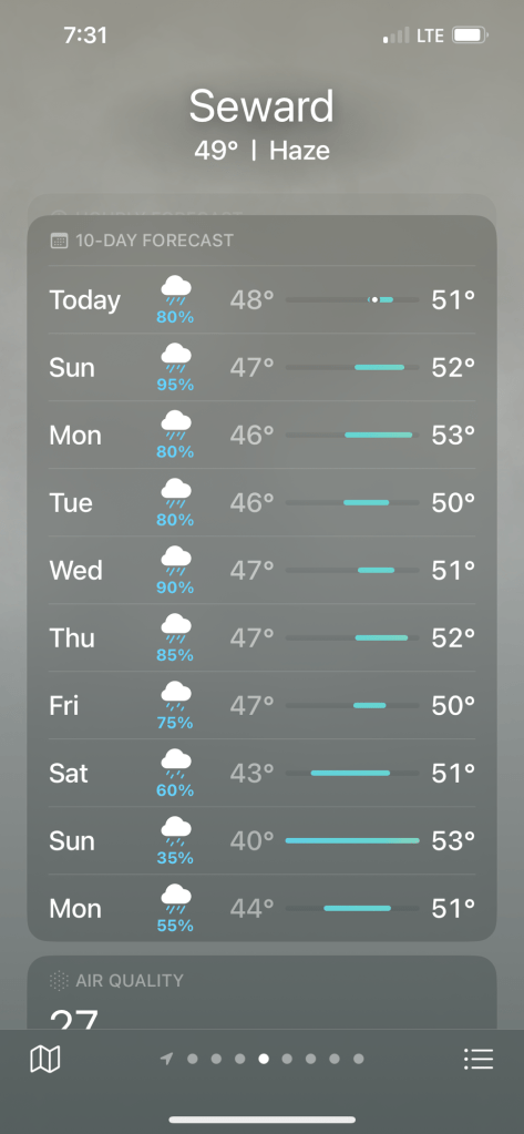 There were two things I really wanted to do in Seward. I was trying not to be discouraged that the weather forecast was predicting rain every day for the next ten days. I was going to enjoy the opportunities my friend Debbie was helping me have even if it was raining. I confirmed my spaces for two group led tours which would go out even in the rain. I was surprised to learn that thunderstorms, which were a constant source of fear and concern on the Continental Divide Trail, the Arizona Trail, the PNT and many other hikes, were extremely rare in Alaska. These storms require a quantity of warm air to rise, causing an electrical charge with the colder air in the clouds. So far, the ground temperature in Alaska is not warm enough to create this temperature differential in the clouds.