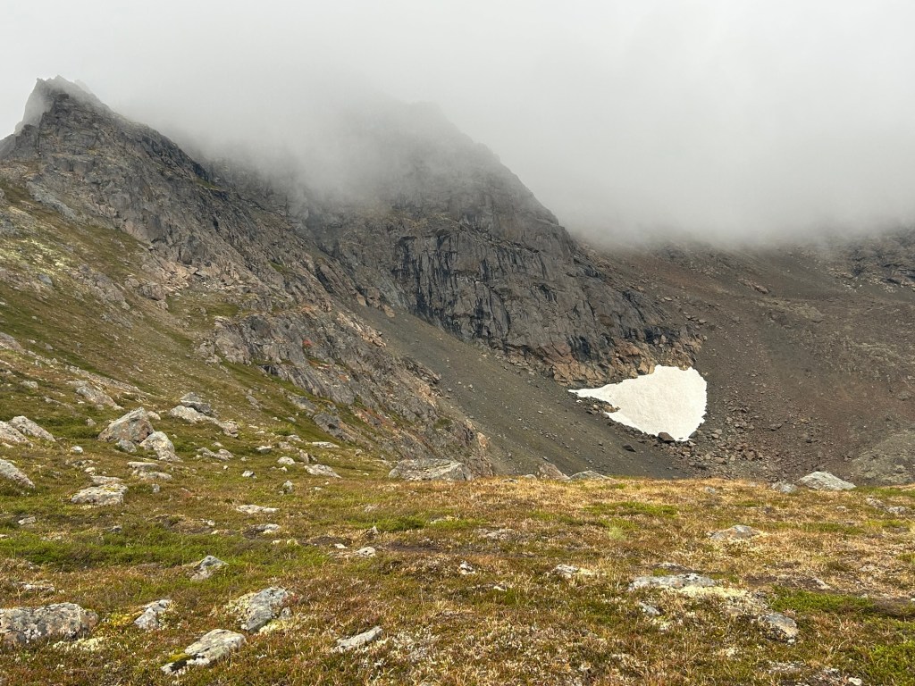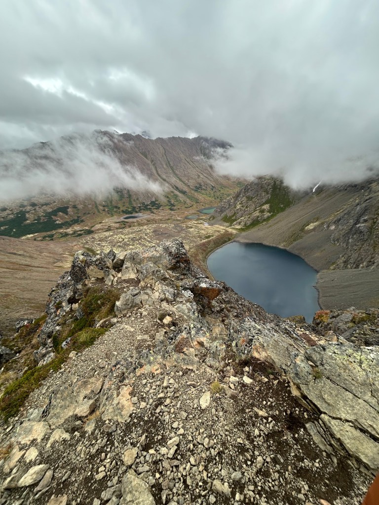 Over these past five years, I’ve learned to enjoy hiking by myself, but I also enjoy hiking with other people. I’ve discovered each person I hike with adds a different flavor to my hiking experience and Grace added much pleasure to my hike in the Chugach Mountains. We both enjoyed stopping numerous times to explore flowers, rocks and other items along the way. Together, we decided to wait out a cold, wet cloud that engulfed us when we reached the top of our climb. We were rewarded with some spectacular views when the cloud passed by.