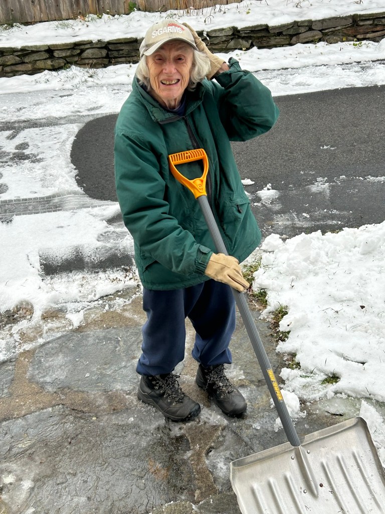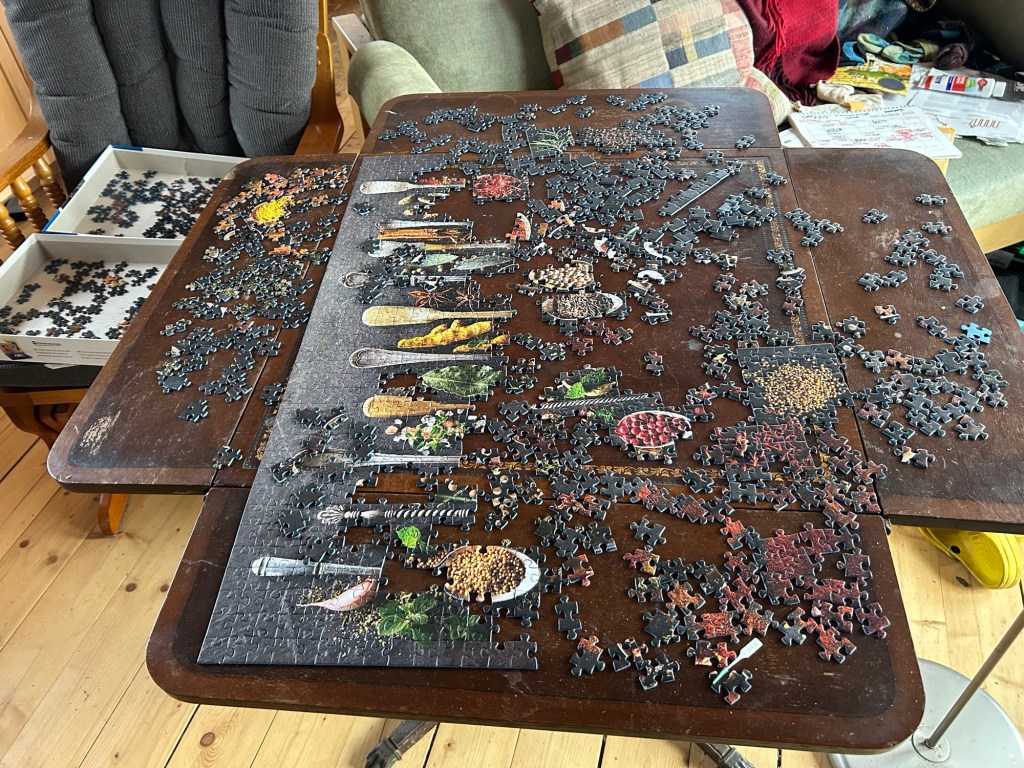 Frustrated and on the verge of tears, I distracted myself by putting a few pieces in a jigsaw puzzle I was working. I learned when stuck doing a difficult puzzle, if I walk around to a different side of the table and look at it from a different perspective I am often able to get unstuck and make progress. I decided I would do the same with my doors. I realized I could squeeze my shoulder out the front door enough to get my broom through. By using my broom, I was able to pull towards me a tool I keep on the porch for chopping ice. I brought that tool into the house and opened the kitchen door the few inches I could. Then with slow, painful maneuvering I was able to chop some of the ice away to get the door open enough for me to squeeze through. Then I shoveled off the rest of that porch and my basement door. I actually managed to bring a few loads of wood into the basement before I had to stop because my burnt foot was screaming at me.