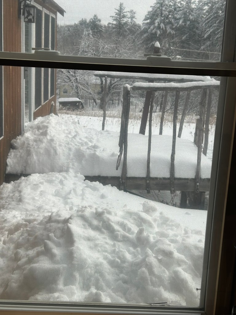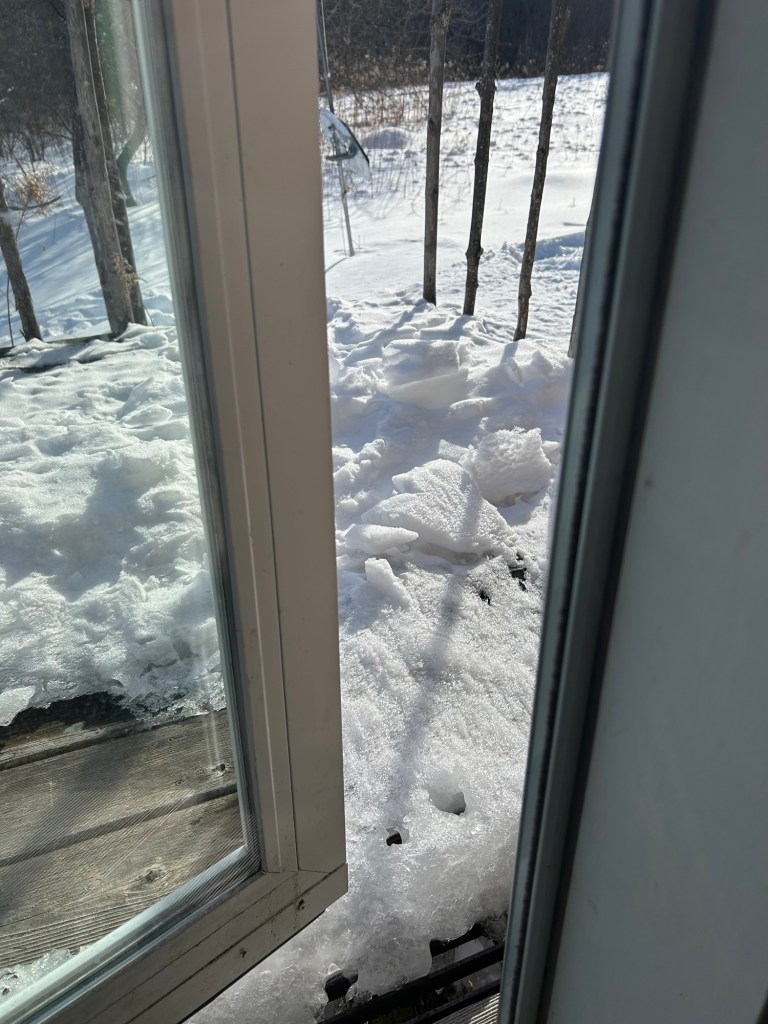 I put this wisdom to use recently when I really was hemmed in. After 31 days when it didn’t get above freezing and was often well below zero, it was slightly warmer out. (A whopping 34°f which made a big difference for my foot which gets painfully cold since some of the insulating fat layers were burnt when the insole exploded.) I decided it would be a good day to bring more wood into my basement. The problem was I literally could not get out of my house. Despite having four doors, I couldn’t get out any of them. I had not shoveled the snow away from the basement door, and as the storm door opened out, I couldn’t budge it. It was the same for the door going out through the greenhouse. I had shoveled the porch out my kitchen door, but since then snow had fallen off the roof and formed a large ridge of ice outside the door, only allowing me to open the door about 2 inches. My main door has a roof over the porch, so snow was not the issue. The problem there was that with all the cold temperatures the porch had frost-heaved and would only allow me to open the storm door about 4 inches before the door jammed on the risen porch deck. I was trying to do something positive for myself by bringing in wood, and I couldn’t even get out of my house!